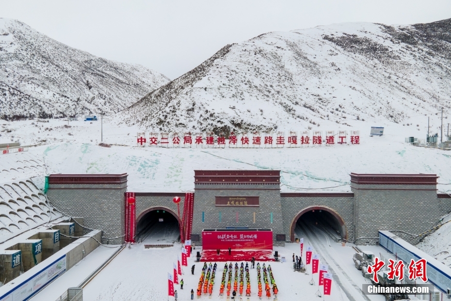 3月28日,西藏S5線拉薩至澤當快速通道項目控制性工程圭嘎拉隧道左洞實現(xiàn)貫通。圖為西藏圭嘎拉隧道左洞貫通儀式現(xiàn)場。(無人機畫面)