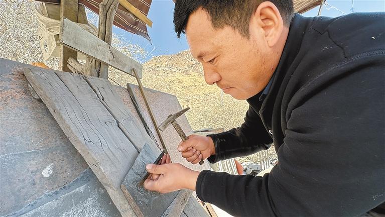 今年35歲的桑周才仁出生在石刻世家,父輩都是石匠,算起來(lái)他也是家族石刻技藝的第六代傳承人了。自幼,桑周才仁就對(duì)石頭有一種特殊的情感,14歲就開(kāi)始接受父親的指導(dǎo),悉心學(xué)習(xí)刻字、線雕、浮雕、繪畫(huà)等與石刻相關(guān)的技藝?!翱套质鞘碳妓囍械幕A(chǔ),需要反復(fù)練習(xí),刻不好就得磨掉重做,直到刻出滿意的作品為止?!鄙V懿湃蕦?duì)記者說(shuō),當(dāng)時(shí)聽(tīng)到父親一句“刻得很好”的評(píng)價(jià),他就能高興一整天。
