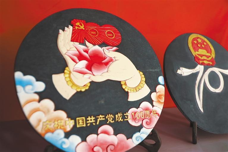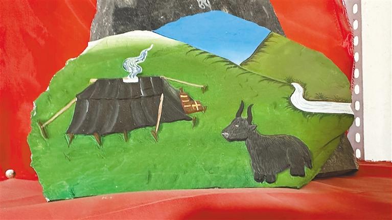 “我們首先要選好一塊石頭,根據(jù)它的形狀和質(zhì)地來(lái)決定刻成一幅什么樣的作品,然后再畫(huà)出作品的輪廓進(jìn)行雕刻,最后一步則為上色?!鄙V懿湃薀崆榈貛覀儏⒂^他的工作室,“慶祝中國(guó)共產(chǎn)黨成立100周年”“牧家生活”“扎西德勒”“白海螺”“和氣四瑞像”……每一幅作品活靈活現(xiàn)在大大小小石板上,栩栩如生、惟妙惟肖,堅(jiān)硬的石頭在他出神入化的雕工下竟變得柔軟,又不失力量和美感。