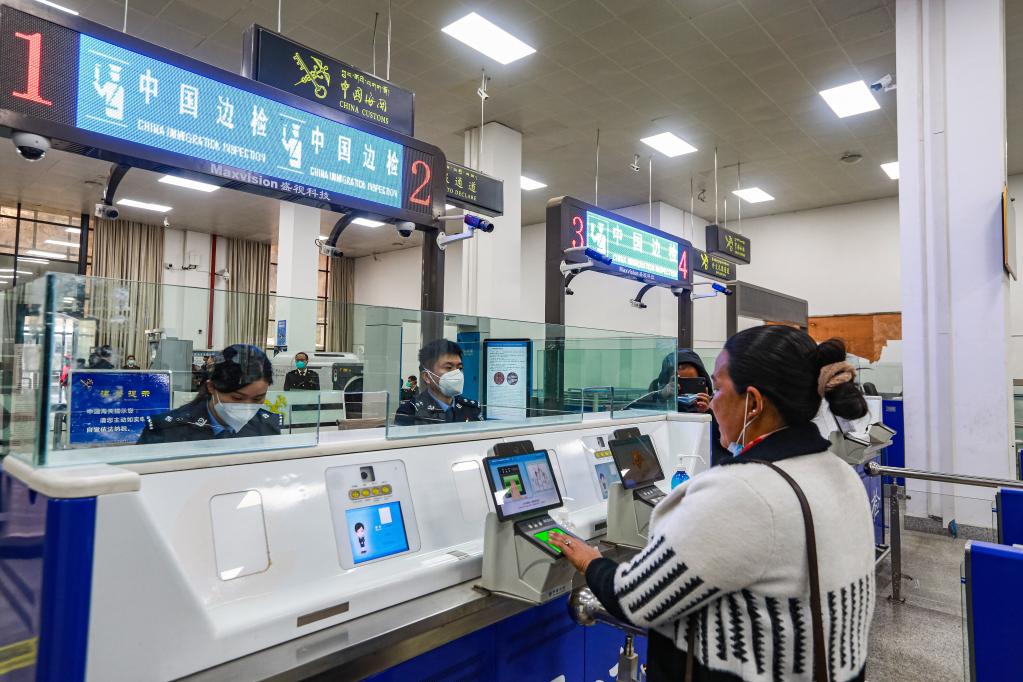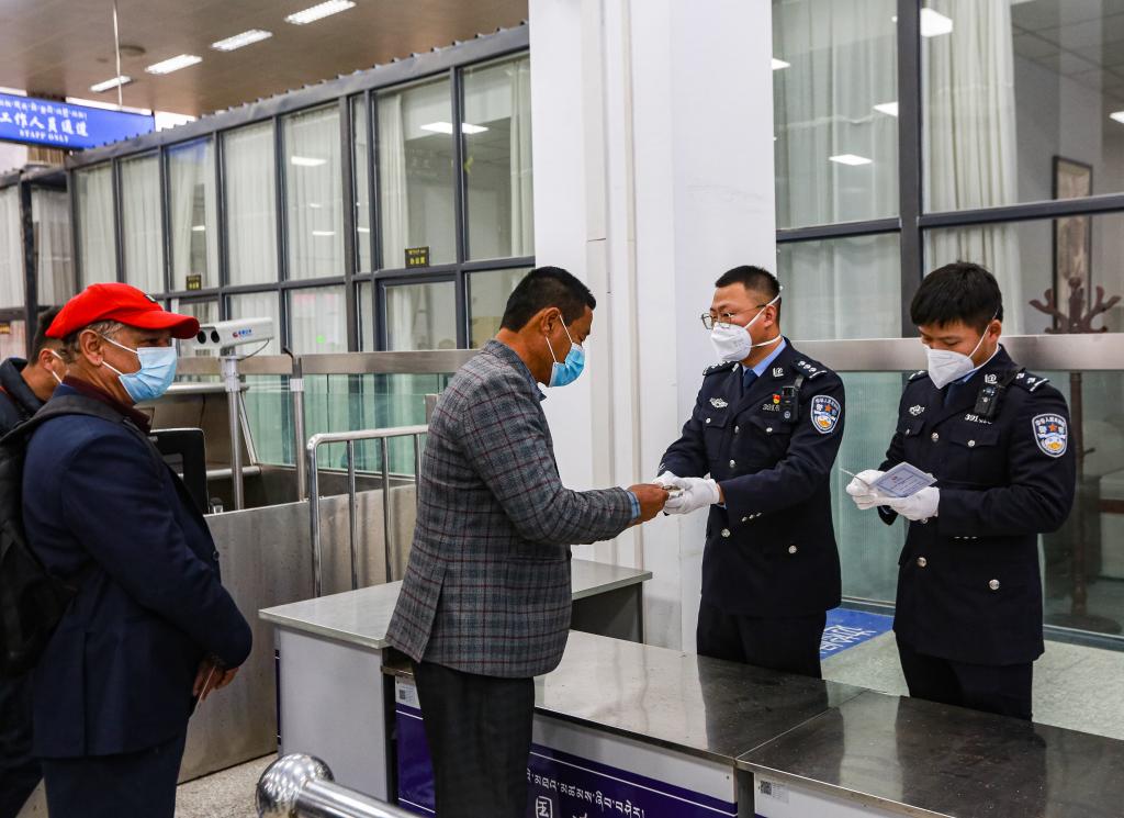 4月1日,移民管理警察在吉隆口岸驗放入境旅客。新華社發(fā)(肖富貴 攝)