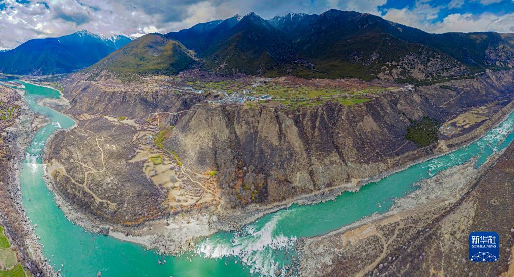 鳥瞰雅魯藏布江畔的索松村(無人機拼接照片,4月5日攝)。新華社記者 姜帆 攝