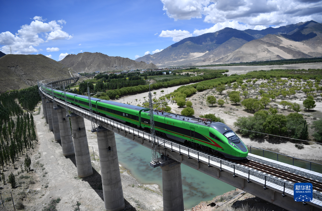 這是行駛在西藏山南市境內(nèi)的復(fù)興號列車。(2022年6月22日攝)。新華社記者 覺果 攝