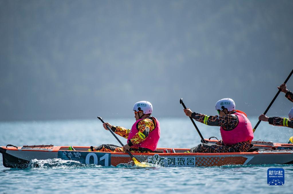 4月15日,選手們?cè)?00米靜水雙人漂流艇競(jìng)速賽中(無(wú)人機(jī)照片)。新華社記者 孫非 攝
