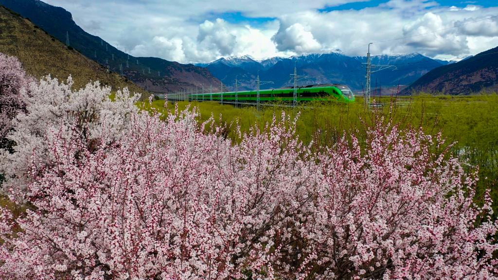 復(fù)興號列車行駛在兩側(cè)桃花盛開的拉林鐵路上(無人機照片,3月25日攝)。新華社記者姜帆 攝