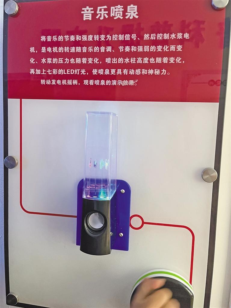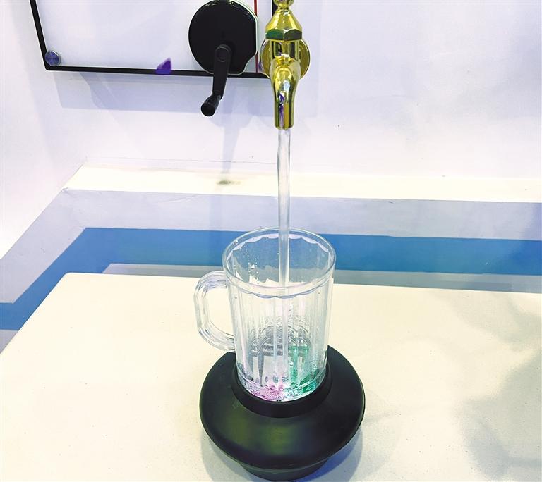 “這個體驗(yàn)項(xiàng)目叫‘天上來水’。設(shè)計者巧妙設(shè)計水流通過水泵及透明玻璃管壓入水龍頭內(nèi),在封閉的水龍頭出口處將水溢出管口,溢出的水又將玻璃管隱蔽,水流的循環(huán)造成觀眾難以發(fā)現(xiàn)特殊裝置的奧秘,從而形成人為制造的錯覺?!斌w驗(yàn)結(jié)束后,索央向小朋友解釋“天上來水”的科學(xué)原理。