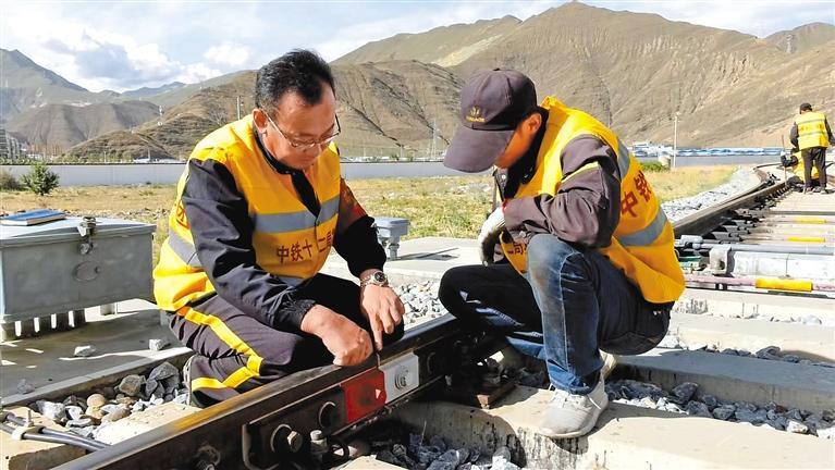 5月1日,2023年“西藏五一勞動獎章”獲得者劉祥斌(左)和同事在青藏鐵路拉薩工區(qū)巡檢鐵路。李洲 攝