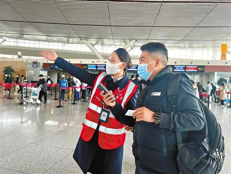 5月1日,拉薩貢嘎機場旅服部工作人員在給旅客指引方向。扎西頓珠 羅珍 攝