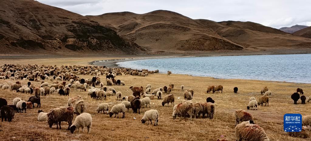 羊卓雍錯(cuò)湖邊的羊群(5月1日攝,手機(jī)照片)。新華社記者 沈虹冰 攝