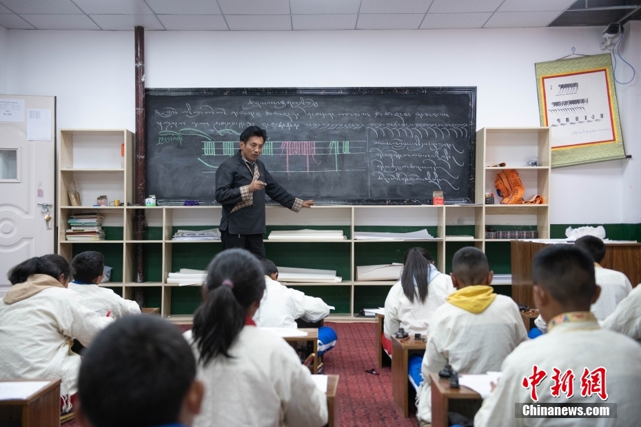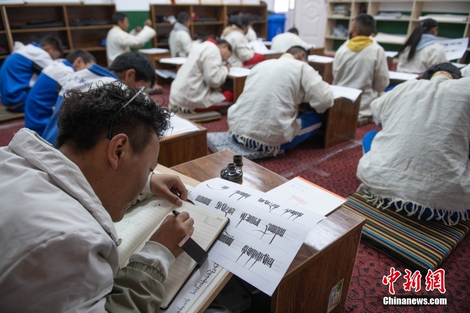 5月7日,西藏山南市,加查縣中學(xué)藏文書法興趣班的教師扎西達(dá)瓦給學(xué)生們上課。該興趣班由2名藏文教師任教,每周兩課時,利用自習(xí)課或晚自習(xí)時間為學(xué)生和教師授課。課程內(nèi)容包含執(zhí)筆、運(yùn)筆、姿勢等基礎(chǔ)書寫技能,以及藏文中的烏金體、珠擦體、簇仁體、簇通體等各類字體的書寫方法。
