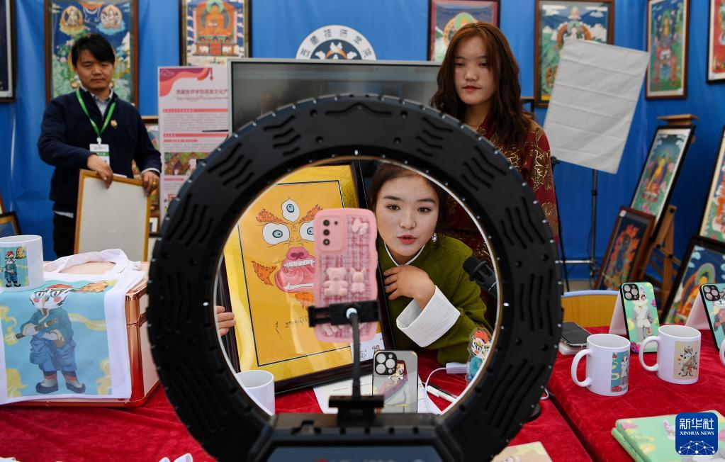 5月10日,西藏技師學(xué)院學(xué)生直播展示師生制作的手工藝品。新華社記者 張汝鋒 攝