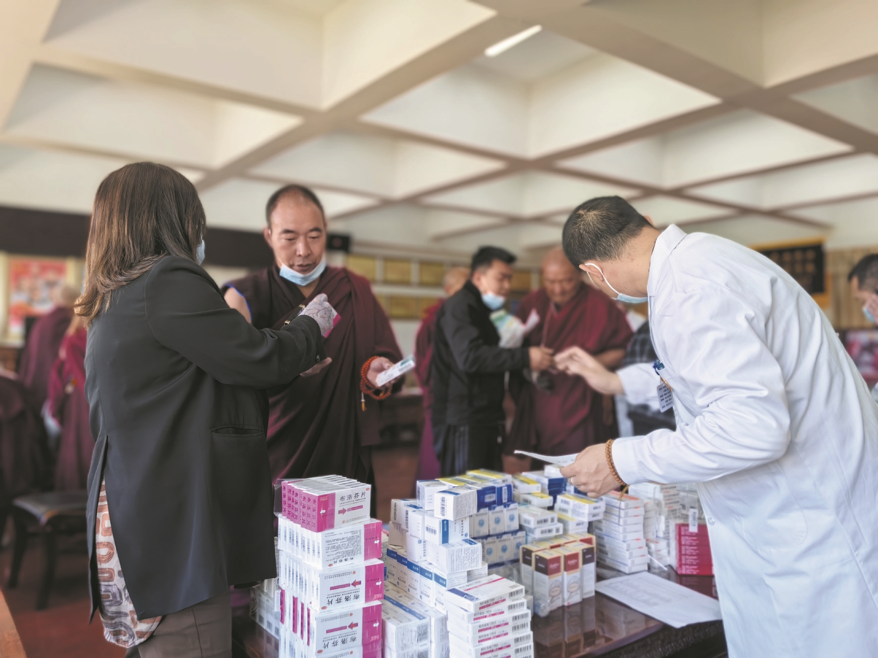 圖為義診現(xiàn)場,北京市第八批援藏醫(yī)療隊的醫(yī)務(wù)人員熱情接待前來就診和咨詢的僧人,并發(fā)放藥物。 拉薩融媒記者 拉姆次仁攝