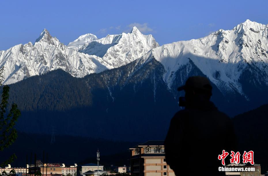 圖為5月13日,游客正在拍攝西藏波密縣雪山風光。李林 攝