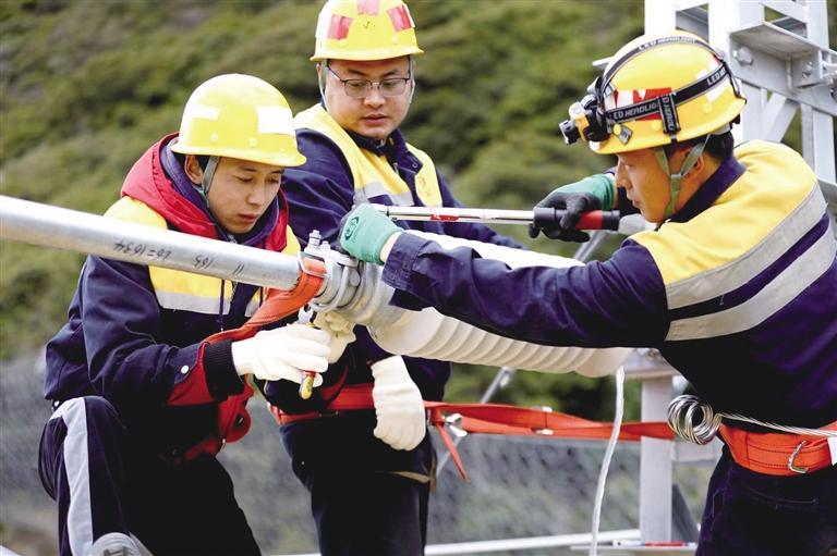 “高空作業(yè),大家把安全帽戴好!”彭江江不時提醒道。王偉點頭示意回應工長彭江江,隨后輕車熟路地將安全帶系在斜腕臂上,右手緊緊抓住上方的腕臂,右腳跨上懸空的定位管,左腳一蹬,穩(wěn)穩(wěn)地站在了斜腕臂上。工友蔣瀟和次仁加布也嫻熟地爬了上來,他們動作靈活協(xié)調(diào),身手敏捷矯健,整個過程連貫一通,無一點拖泥帶水。