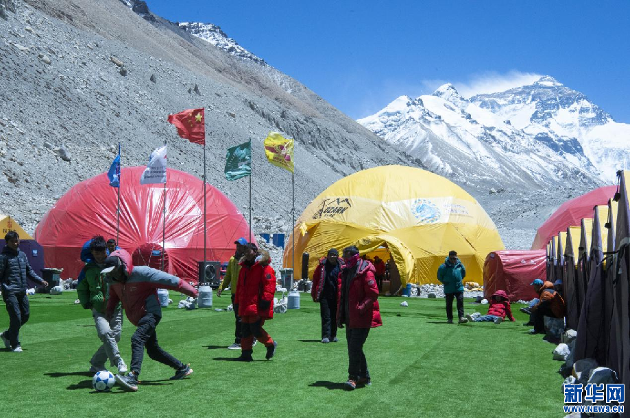 5月9日,登山隊(duì)員在珠峰大本營踢球。新華網(wǎng) 旦增努布 攝