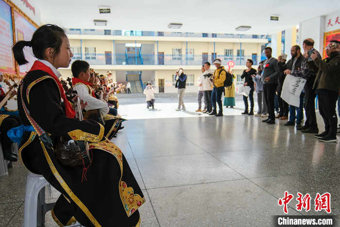 進入校園后,歡快的扎念琴聲傳來,十多位孩子聚在一起彈奏著。一曲表演完畢,現(xiàn)場掌聲熱烈。