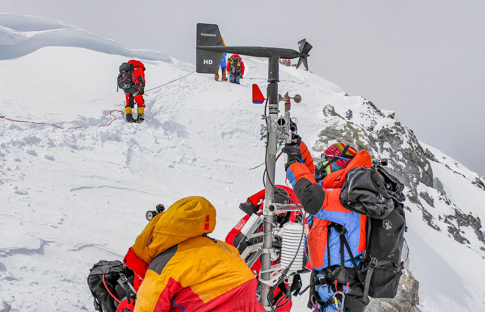 當日凌晨3時,科考隊員從海拔8300米的突擊營地出發(fā),歷經(jīng)數(shù)小時攀登,終于抵達海拔8830米的世界最高自動氣象觀測站。固定鋼筋繩索,更換蓄電池,安裝風速風向傳感器……經(jīng)過約1小時的緊張工作,氣象站零部件升級工作全部完成。隨后,他們攀登至8848.86米的峰頂,利用工具成功采集雪冰樣品。