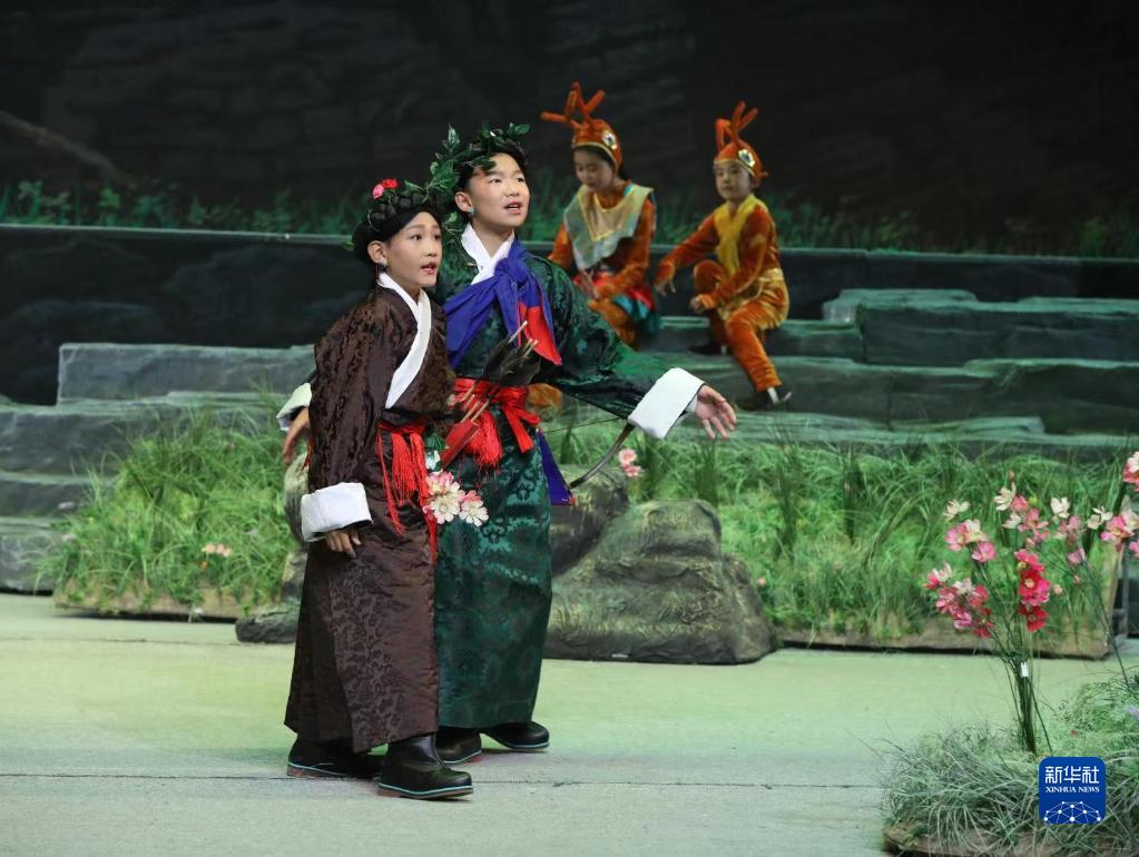 藏戲小演員在舞臺(tái)上表演少兒舞臺(tái)劇藏戲《頓月頓珠》。