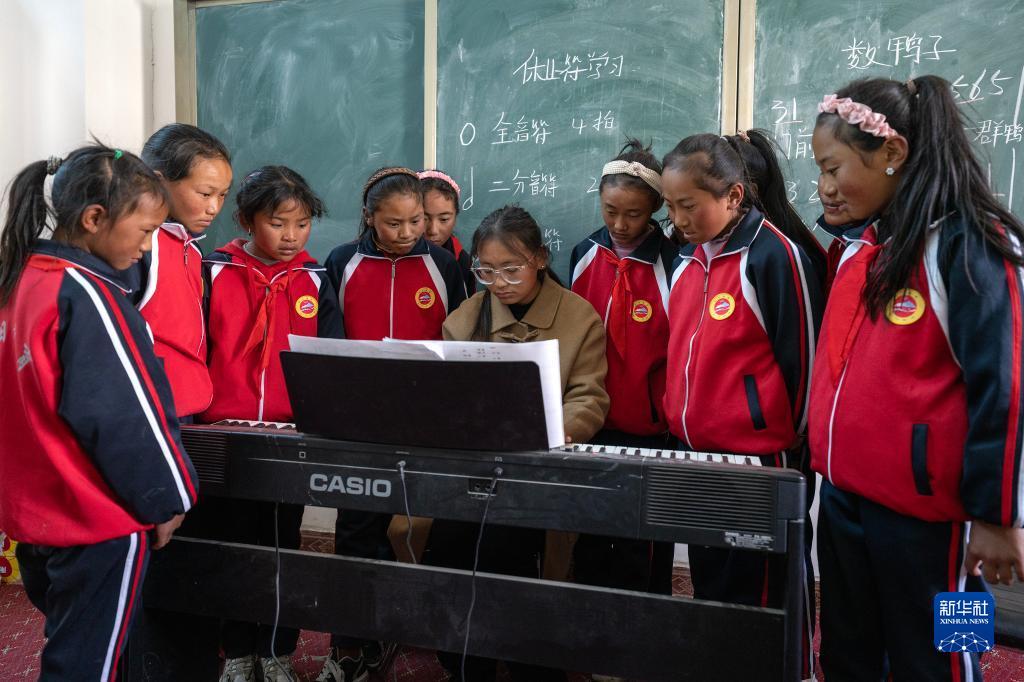 鋼琴課教室里又響起了歡快的樂(lè)曲聲,那是巴桑老師在教旦增吉宗和她的小伙伴們一首當(dāng)?shù)馗枨段业募以谌湛t》:“你的家在哪里,就在日喀則呀……日喀則是好地方……”