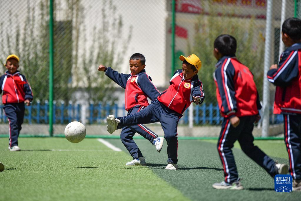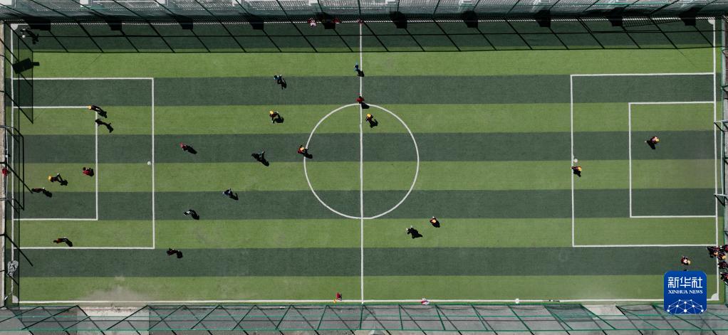 扎西宗鄉(xiāng)完全小學(xué)的學(xué)生在體育課上踢足球(6月5日攝,無(wú)人機(jī)照片)。新華社記者 晉美多吉 攝