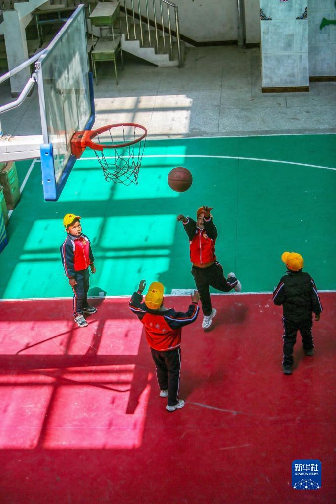6月5日,扎西宗鄉(xiāng)完全小學(xué)的學(xué)生在室內(nèi)體育館上籃球課。新華社記者 費(fèi)茂華 攝