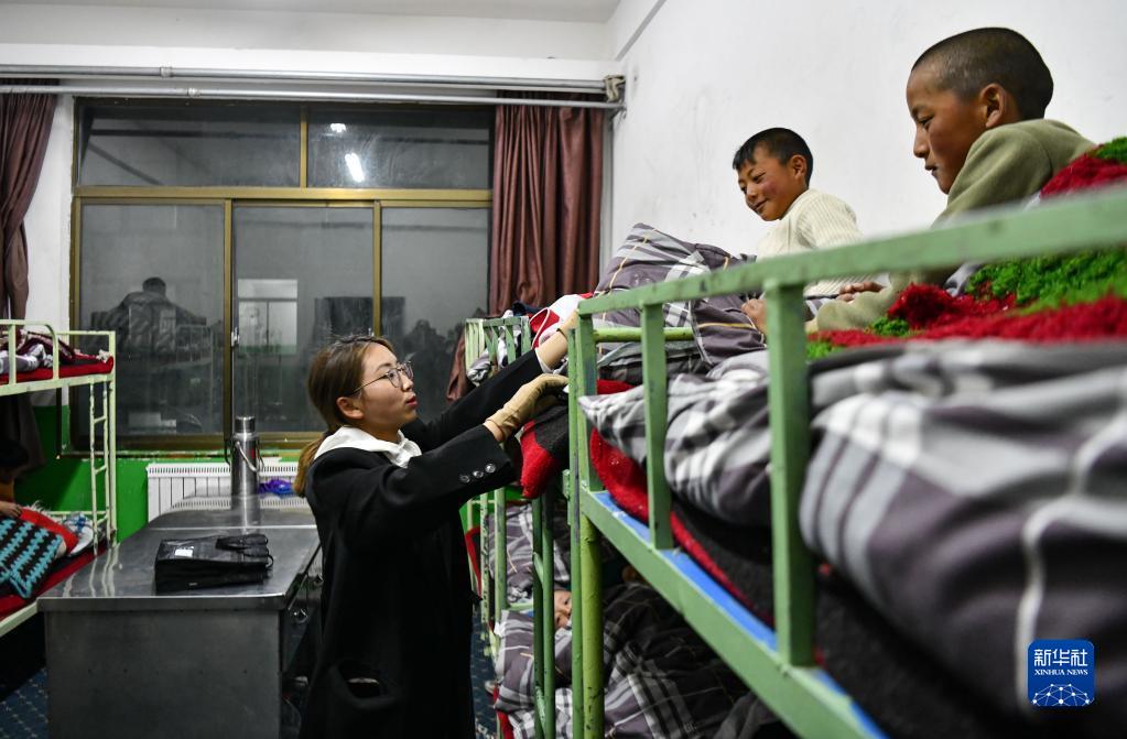扎西宗鄉(xiāng)完全小學(xué)的值班老師在檢查孩子睡覺(jué)時(shí)是否蓋好被子(6月5日攝)。新華社記者 晉美多吉 攝