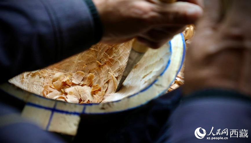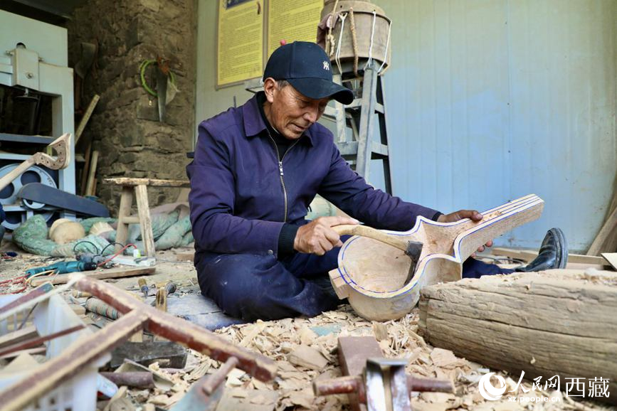 娘嘎扎念琴制作技藝傳承人羅布次旦在制作扎念琴。人民網(wǎng)記者 次仁羅布攝