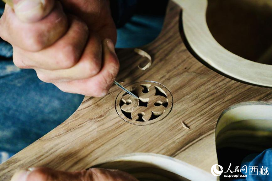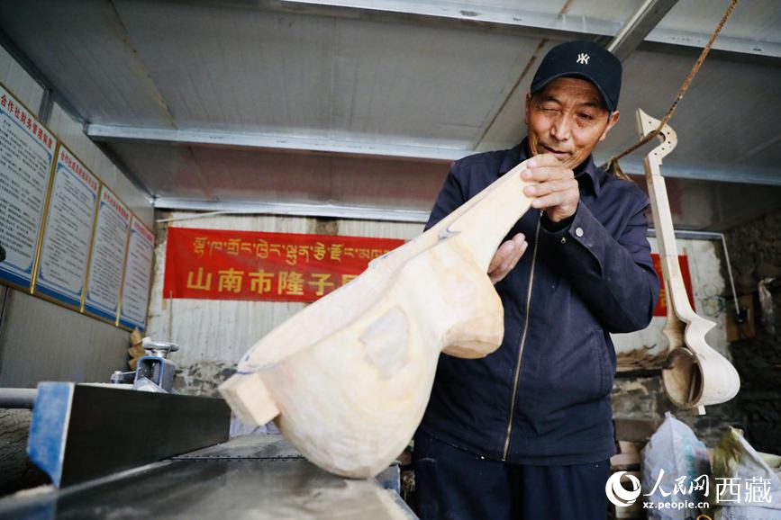 傳承人羅布次旦檢查琴體打磨后的樣板。人民網(wǎng)記者 次仁羅布攝