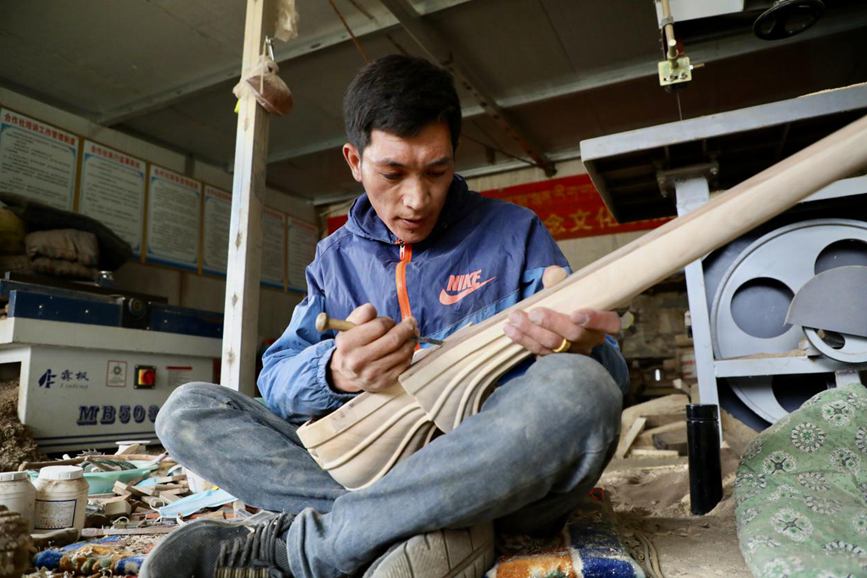 娘嘎扎念琴制作技藝傳承人羅布次旦的兒子在制作扎念琴。人民網(wǎng)記者 次仁羅布攝