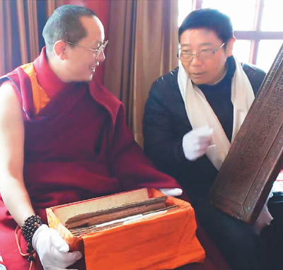 項(xiàng)目總顧問(wèn)丁真俄色(左)與西藏自治區(qū)古籍保護(hù)中心研究館員、古籍專(zhuān)家白張?zhí)接懝偶Wo(hù)。