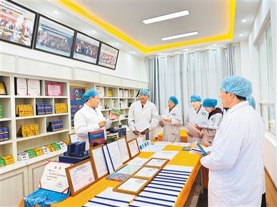 平措饒吉(左一)在介紹作為項(xiàng)目成果轉(zhuǎn)化的藏醫(yī)藥品。