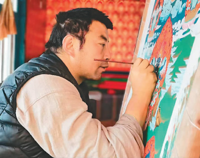 象雄唐卡畫(huà)家嘎松旺加在繪畫(huà)唐卡。據(jù)介紹,唐卡畫(huà)風(fēng)的傳承最早可追溯到古象雄時(shí)期,其佛像繪制主要依據(jù)了《古象雄大藏經(jīng)》中的度量法。
