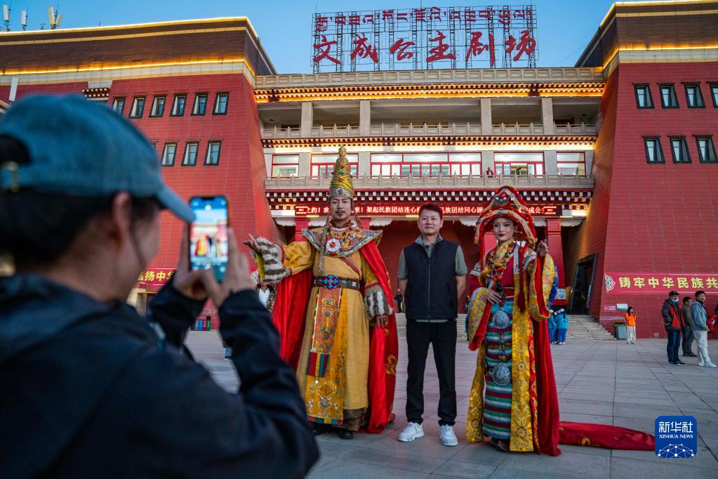 游客在文成公主劇場前和演員合影留念(6月6日攝)。新華社記者 孫非 攝