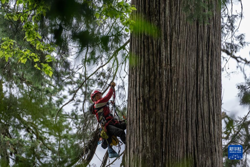 6月15日,攀樹專家劉團(tuán)璽在攀爬亞洲第一高樹前做準(zhǔn)備工作。新華社記者 晉美多吉 攝