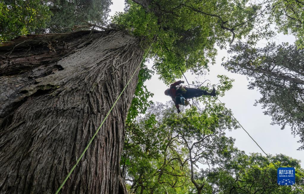 6月15日,國家重要野生植物種質(zhì)資源庫辰山中心負(fù)責(zé)人鐘鑫(下)和助手在攀爬亞洲第一高樹附近的高樹,采集數(shù)據(jù)。新華社記者 晉美多吉 攝
