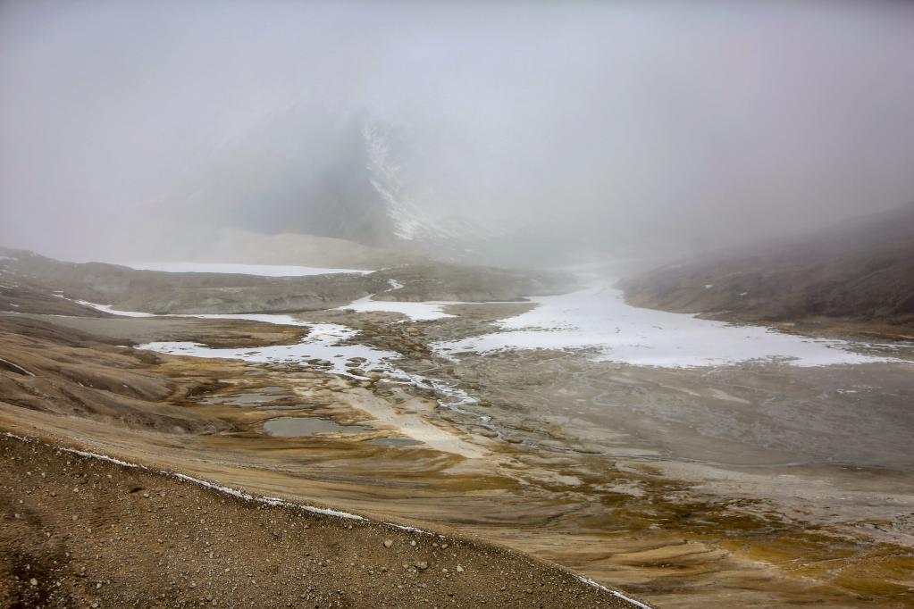 如果說札達(dá)土林和古格王國遺址給人的印象可以用宏偉壯觀來形容的話,那么雅魯藏布江發(fā)源地——杰瑪央宗冰川給人帶來的則是蕭瑟與遼闊的景象。我們趕到杰瑪央宗冰川的時(shí)候風(fēng)雪交加。凜冽的寒風(fēng)呼呼地刮在臉上像刀割一樣,風(fēng)吹得人幾乎睜不開眼睛。作為本次報(bào)道的視頻記者之一,我當(dāng)時(shí)最擔(dān)心的是機(jī)器拿不穩(wěn),拍攝畫面出現(xiàn)抖動(dòng)的情況,所以拍攝全程我都把手中的相機(jī)攥得很緊。