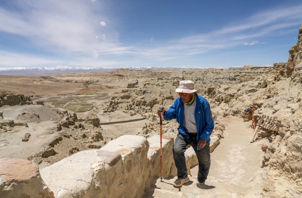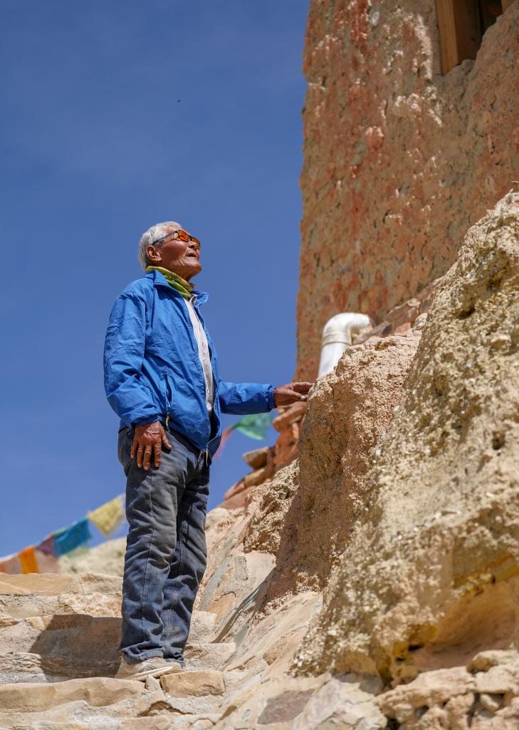 皮央和東嘎石窟遺址位于西藏自治區(qū)阿里地區(qū)札達(dá)縣境內(nèi)的皮央村、東嘎村,由皮央石窟群和東嘎扎西曲林寺遺址組成。由于兩村距離很近,遺址規(guī)模巨大,故命名為皮央和東嘎石窟遺址。仁增旺扎是一位75歲的老人,他從2002年開始被聘為當(dāng)?shù)氐奈奈锉Wo(hù)管理員,從那時(shí)起就一直守護(hù)著皮央和東嘎石窟遺址,至今已經(jīng)有20多年。