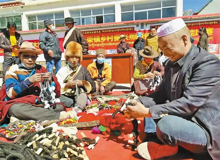 這是在那曲市聶榮縣聶榮鎮(zhèn)“鄉(xiāng)村振興 那曲奮進”活動中,藏族群眾和回族群眾在交流手工藝品的制作方法。