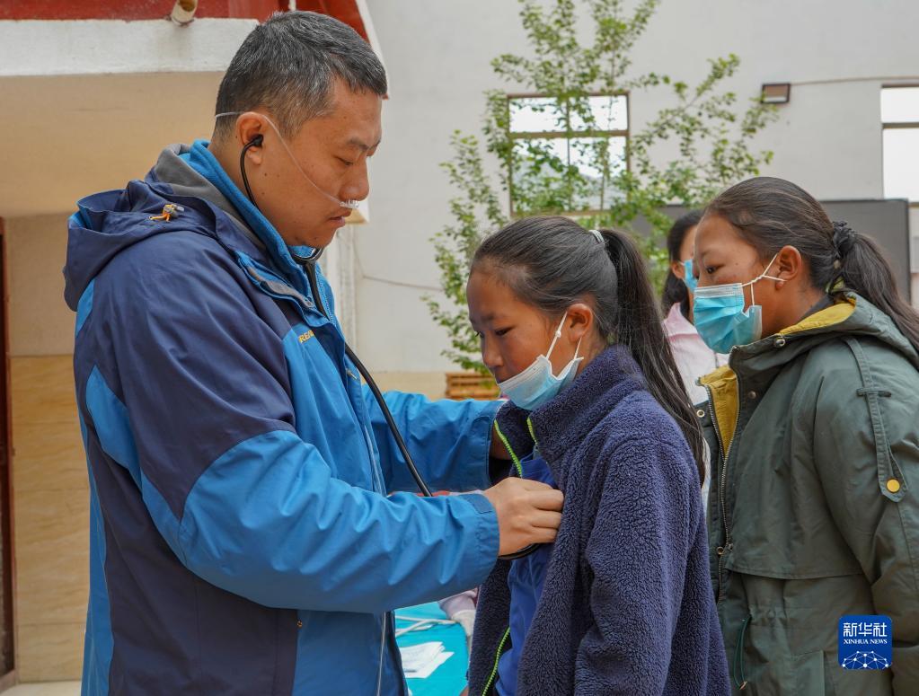 7月4日,“心佑工程”項(xiàng)目發(fā)起人耿直醫(yī)生給被篩查兒童做心臟聽診。新華社記者 邵澤東 攝
