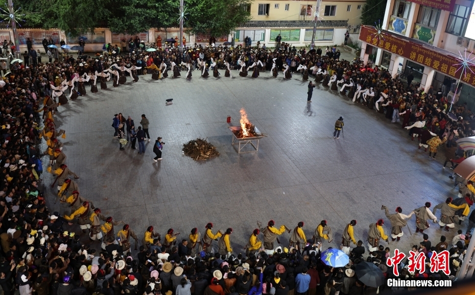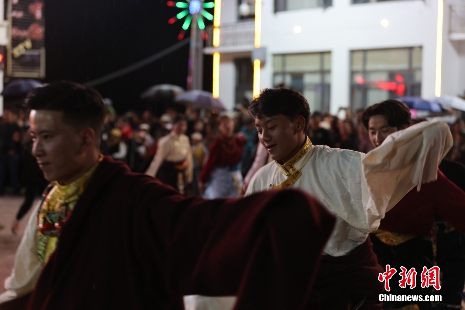 7月15日,西藏自治區(qū)昌都市貢覺(jué)縣阿旺綿羊文化商貿(mào)旅游節(jié)在當(dāng)?shù)嘏e行。當(dāng)?shù)孛癖娫陂_幕式前夜點(diǎn)起篝火,載歌載舞歡迎各地游客。