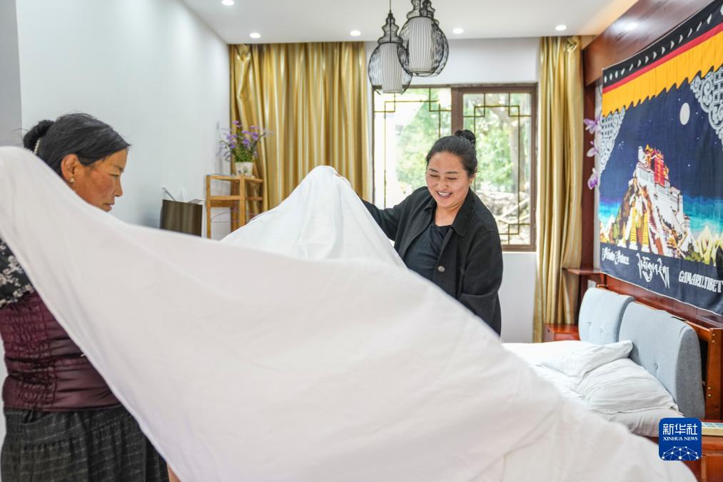 在結(jié)巴村的瑪尼石民宿,村民次仁德吉(右)和姐姐一起整理房間(7月20日攝)。新華社記者 孫非 攝