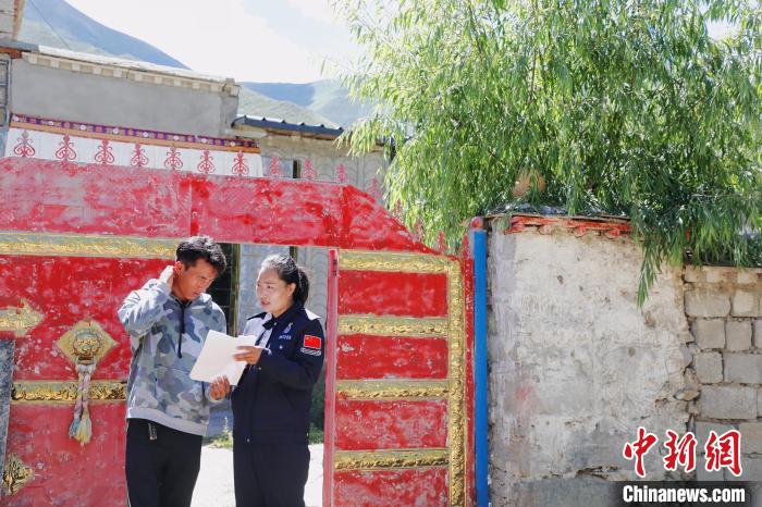 圖為索朗曲珍為鄰居解答戶(hù)籍辦理的相關(guān)政策?!?yīng)俊 攝