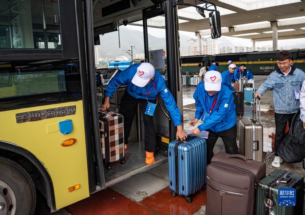 7月24日,在拉薩火車(chē)站,工作人員幫剛剛抵達(dá)拉薩的志愿者搬運(yùn)行李。新華社記者 孫非 攝