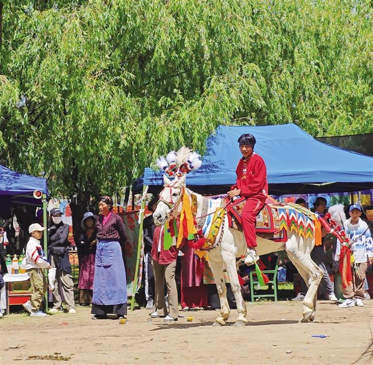 賽場(chǎng)上,幾個(gè)稚嫩的小伙子引起了大家的注意。他們熟練地跳上馬背、抓緊韁繩、目光堅(jiān)定?!巴郏√袅?!”“媽媽,那個(gè)哥哥拿到了哈達(dá)!”……只見16歲的單增阿旺策馬奔騰,俯身拾起地上的綠色哈達(dá),獲得大家的陣陣掌聲?!拔覐男【秃芟矚g騎馬,除了去年因?yàn)閷W(xué)業(yè)緊張,沒能參加賽馬表演,往常每年都會(huì)參加?!眴卧霭⑼f。