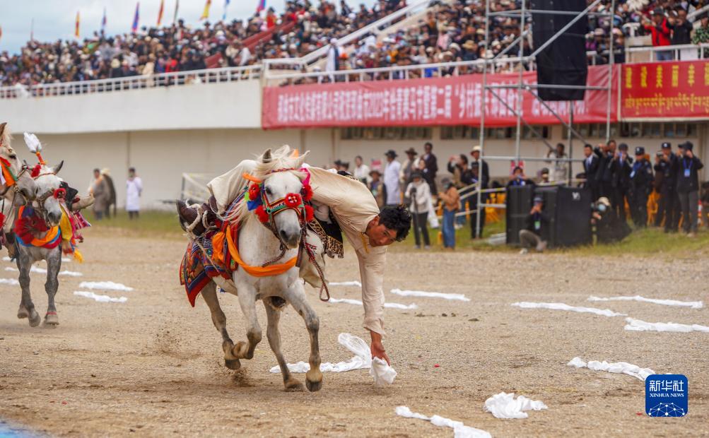 8月10日,騎手表演跑馬拾哈達(dá)。新華社記者 劉文博 攝