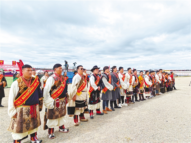 賽馬節(jié)期間,那曲市委、市政府對第二屆“鄉(xiāng)村振興 那曲奮進(jìn)”活動(dòng)市級決賽獲獎(jiǎng)群眾代表進(jìn)行隆重表彰。賽馬場內(nèi),男女老幼手捧哈達(dá)排起長隊(duì),以草原人最熱烈喜慶的方式崇敬心中的“英雄”、歡送身邊的杰出勞動(dòng)者。