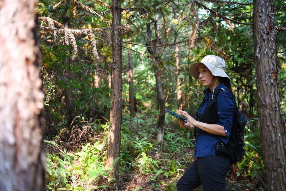 2022年9月22日,白拉曲珍在廣東韶關(guān)樂(lè)昌市張溪村生態(tài)監(jiān)測(cè)樣地工作。新華社記者鄧華 攝