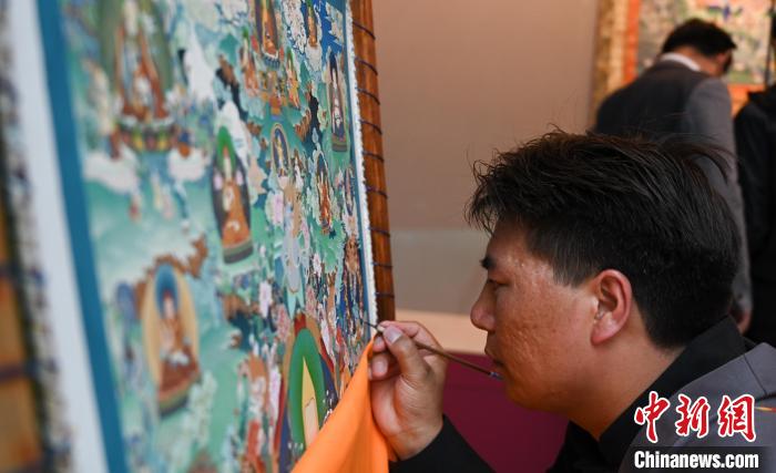 圖為活動現(xiàn)場,唐卡畫師展示唐卡繪制。趙朗 攝