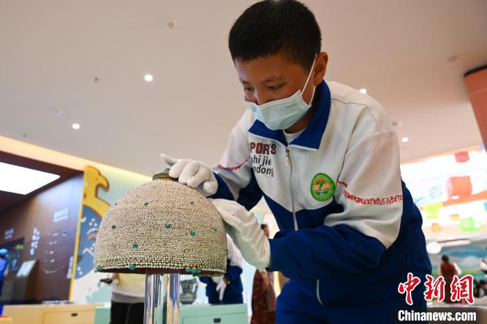 2022年7月,一名學(xué)生在西藏博物館觸摸體驗(yàn)仿真文物。中新社記者 趙朗 攝