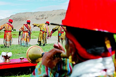 普蘭縣赤德村村民正在表演“仲”舞。光明日?qǐng)?bào)記者 李曾骙攝