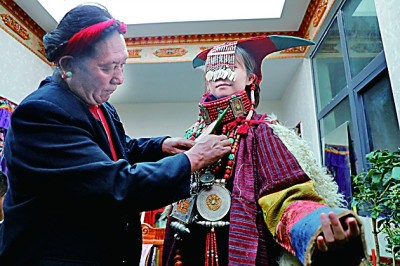 眾多的藝術(shù)形式當(dāng)然也會(huì)催生出絢爛多彩、雍容華貴的普蘭服飾,其中最有名的當(dāng)數(shù)普蘭“宣”服(又稱飛天服),單是穿戴這套服飾就要用一個(gè)多小時(shí)。地處貿(mào)易要道的普蘭人,將遙遠(yuǎn)的珊瑚、黃金、蜜蠟、白銀、綠松石、珍珠全都裝飾在“宣”服上,展示著對(duì)這襲錦袍的無(wú)比珍視。家族世代傳承“宣”服制作技藝的才旺多吉現(xiàn)在不僅把技藝公開(kāi)傳授,每年單靠制作“宣”服,純收入就能達(dá)到四五萬(wàn)元,而且通過(guò)普蘭的邊貿(mào)市場(chǎng),這些服飾還能賣(mài)到尼泊爾和印度。